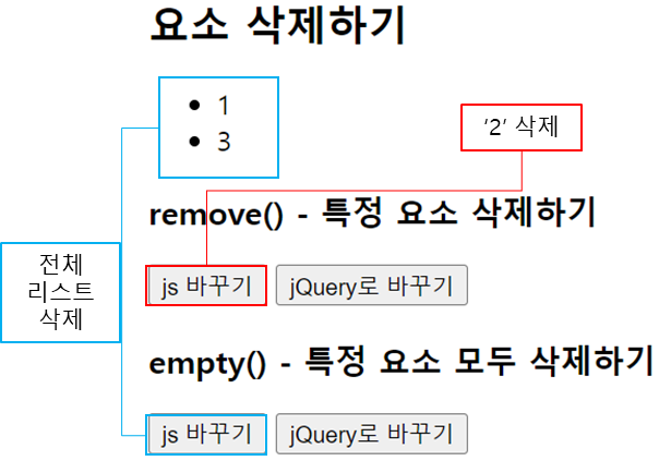 <h3>remove() - 선택된 요소의 자식 요소 중 마지막에 추가</h3>