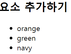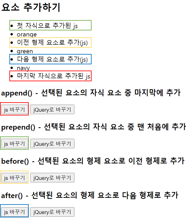 $('.green').after('<li>이전 형제 요소로 추가(js)</li>');
