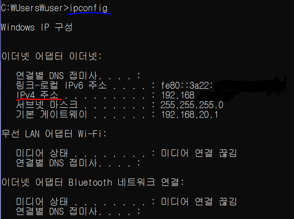 ※ [윈도우 기준] CMD 창에서 ipconfig 라는 cli 명령어를 통해 IPv4 주소 확인 가능