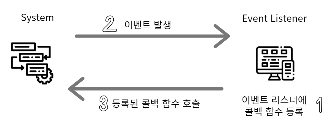 ex) 클릭, 네트워크 요청, 타이머 등 - 이벤트 기반 아키텍처에는 특정 이벤트가 발생할 때 무엇을 할지 미리 등록