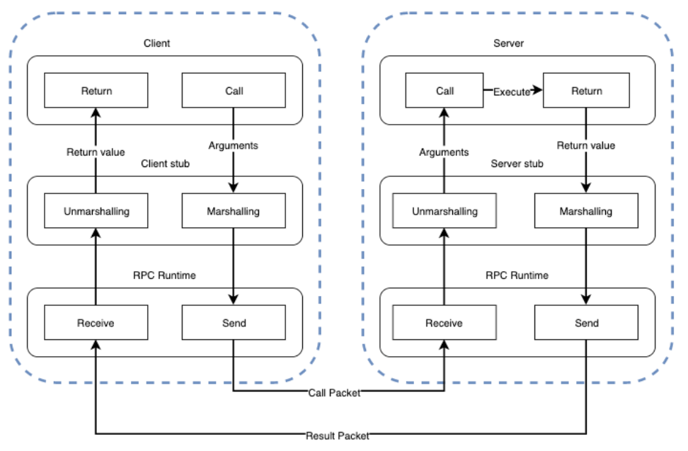 - 네트워크로 연결된 서버 사이의 원격 프로시져를 로컬 프로시져인 것처럼 호출하는 방식