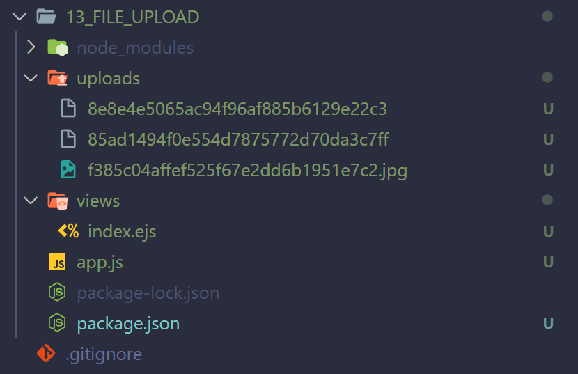 파일을 업로드하면, dest로 설정해 둔 파일인 uploads가 자동적으로 생성되며, 업로드한 파일이 올라간다.