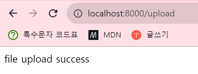 업로드 버튼 클릭 시 지정한 /upload 경로로 이동하여 성공 메시지를 찍어준다.
