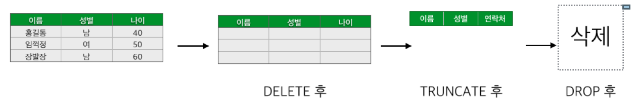| 테이블을 잘못 생성했거나 더 이상 필요 없는 경우 | 테이블의 모든 행 일괄 삭제 |