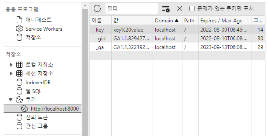 - 이름, 값, 만료일(저장 기간 설정), 경로 정보로 구성