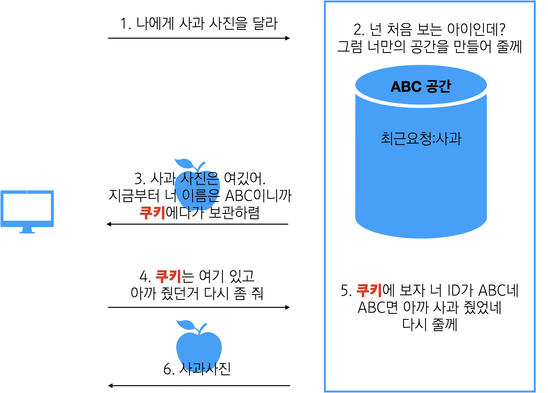 (ex. 로그인을 통해 볼 수 있는 서비스, 장바구니 등등) - 웹 서버가 브라우저에게 지시한 뒤 사용자의 로컬 컴퓨터에 파일 또는 메모리에 저장하는 작은 기록 정보 파일