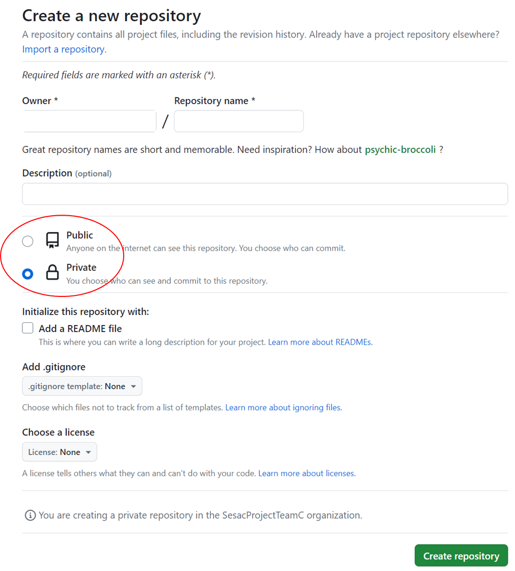레파지토리 생성은 퍼블릭 / 프라이빗으로 설정할 수 있는데,