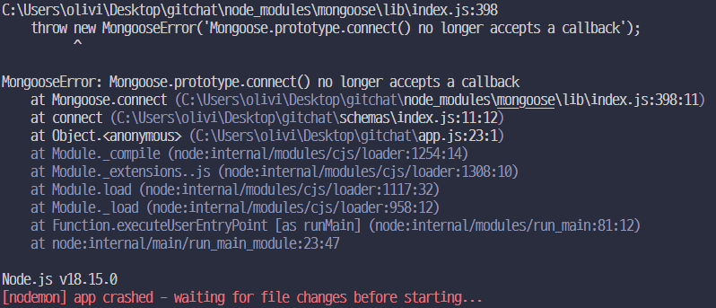 오류 메세지를 읽어보면 connect 함수가 더 이상 콜백을 지원하지 않는다는 것이었다. OwO...