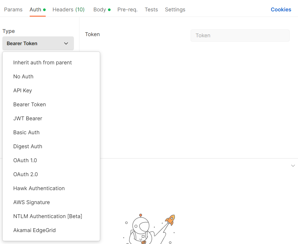 현재 토큰은 req.headers.authorization에 Bearer <token> 형식으로 들어가고 있기 때문에 Bearer Token을 선택해준다.