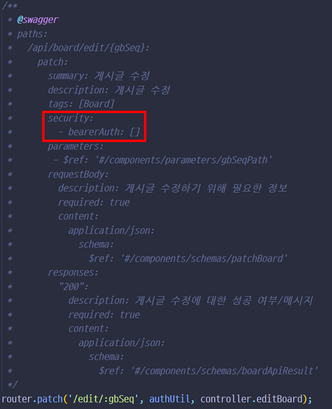 스웨거 코드를 짤 때 박스 안의 저 두 줄을 추가해 주면,