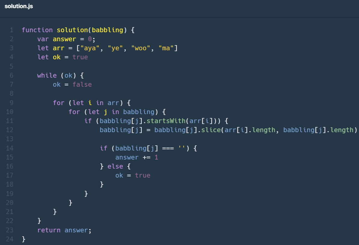 머쓱이는 태어난 지 6개월 된 조카를 돌보고 있습니다. 조카는 아직 "aya", "ye", "woo", "ma" 네 가지 발음을 최대 한 번씩 사용해 조합한(이어 붙인) 발음밖에 하지 못합니다. 문자열 배열 babbling이 매개변수로 주어질 때, 머쓱이의 조카가 발음할 수 있는 단어의 개수를 return 하도록 solution 함수를 완성해 주세요.