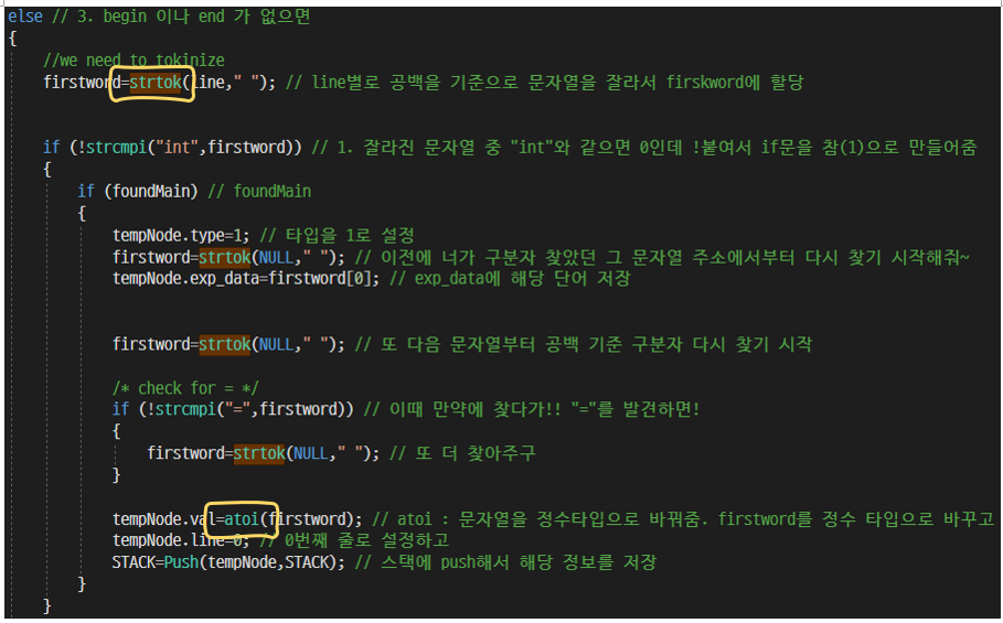 - tempNode의 type은 2로 전환한 뒤, strtok의 첫번째 인자로 NULL을 주어 탐색을 진행하도록 한다. tempNode의 exp_data에는 firstword 리스트의 0번째 데이터를, line에는 curLine을 넣는다. val은 0으로 설정하고 위 정보를 Push로 저장한다.