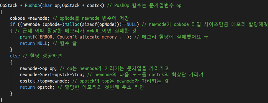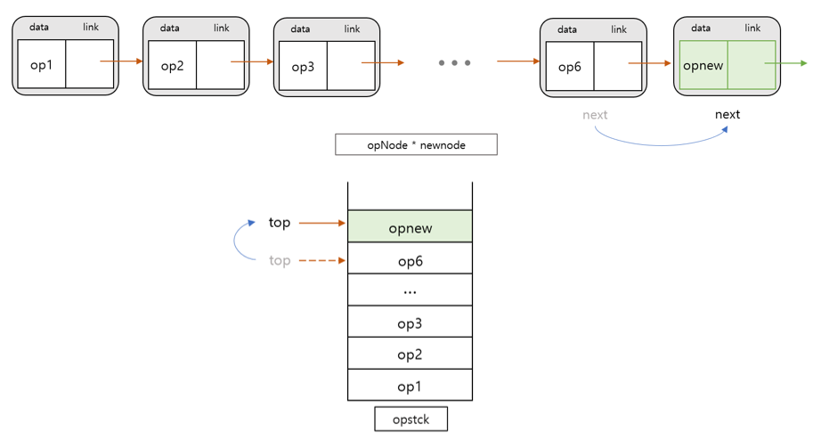 할당이 성공할 경우, op는 newnode가 가리키고 있는 문자열 op을 가리키고 newnode의 다음 노드는 opstck의 top 스택을 가리킨다.