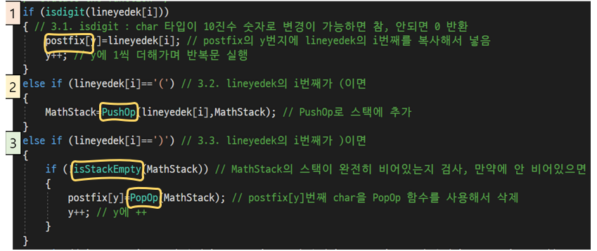 가능하면 postfix의 y번지에 lineyedek의 i번지를 복사해서 넣고, y에 1씩 더해가며 반복한다. - 만약 lineyedek[i]가 (라는 문자이면 앞서 설명한 PushOp 함수를 사용하여 스택에 추가한다.