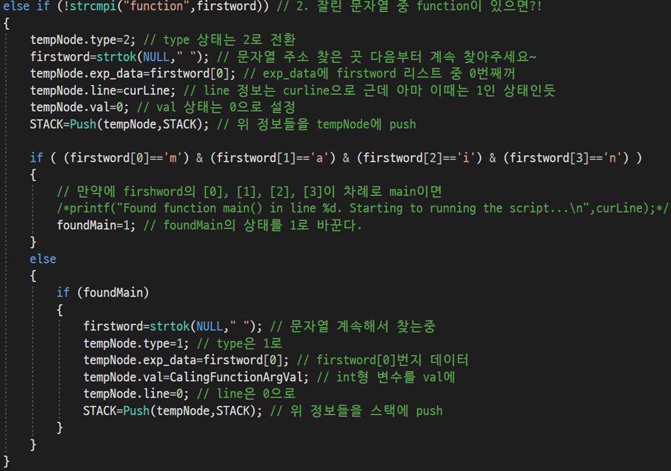 - m, a, i, n을 찾지 못한 경우, else문 내부의 if문으로 들어가 문자열을 찾는 상태로 둔다. tempNode의 type은 1로 전환한 뒤, tempNode의 exp_data에는 firstword 리스트의 0번째 데이터를, val에는 CalingFunctionArgVal을 넣는다. line에는 0을 넣고 위 정보를 Push로 저장한다.