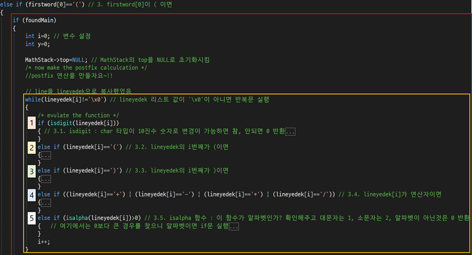 - 2번째 else if문과 비슷하게 진행되는 해당 else if문은 lineyedek[i]가 )라는 문자이면 MathStack이 빈 자리가 있는지 확인하고, 빈 자리가 없는 경우 postfix의 y번지에 있는 문자를 PopOp 함수를 사용하여 삭제한다.