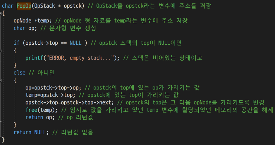문자형 변수 op를 생성하고, 만약 스택의 top이 NULL이면 스택이 비어 있는 상태임을 알리는 에러 메시지를 띄운 뒤 리턴 값이 없이 함수를 종료한다.