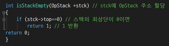 isStackEmpty 함수는 스택이 비어 있는지 아닌지 확인하며 int형 리턴 값을 가지는 함수이다.