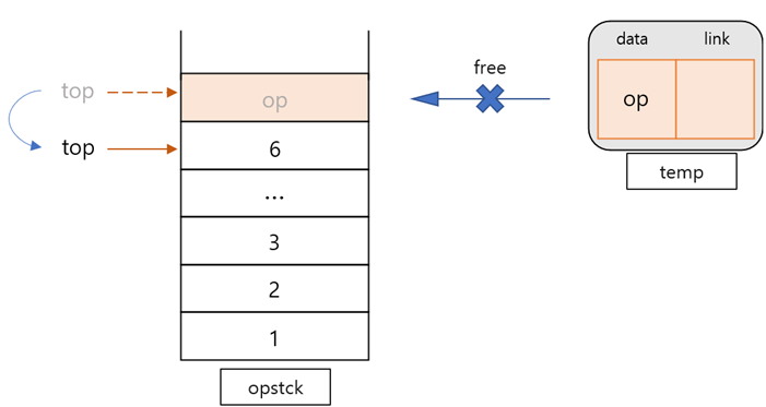 opstck의 top은 그 다음 opNode를 가리키도록 변경되었고, 임시로 값을 가리키고 있던 temp 변수에 할당되었던 메모리의 공간을 해제해준다.