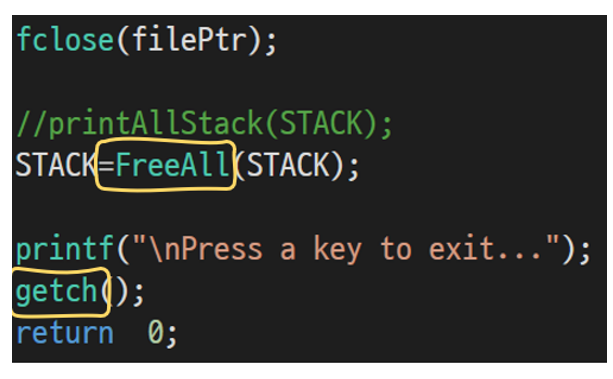 해당 함수는 스택과 연결 리스트에 할당되어있던 메모리를 free를 통해 해제하는 역할이다.