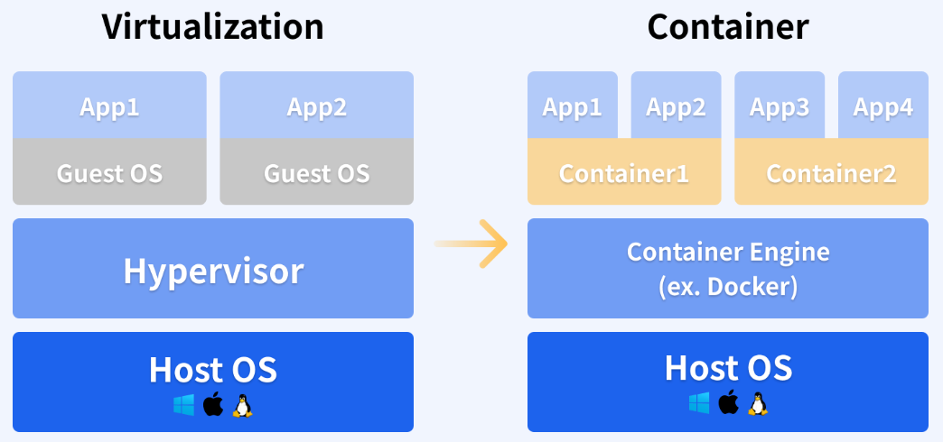 | 가상 머신 (VM, Virtual Machine) | 컨테이너 (Container) | |