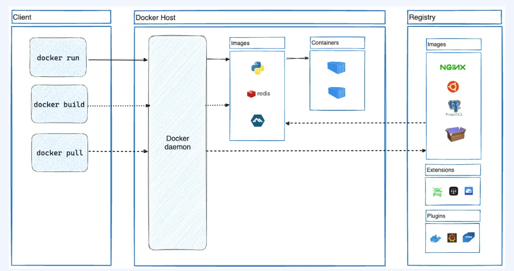 | Docker Client | 사용자가 docker run, docker build 등의 명령어를 사용해 Docker와 상호작용하는 주요 수단 | Docker API로 Docker Daemon에게 명령어 전달 |