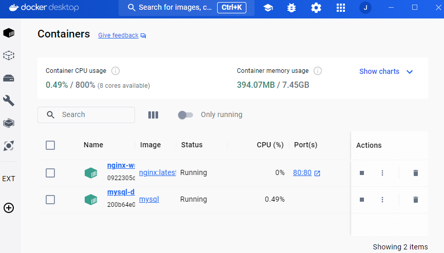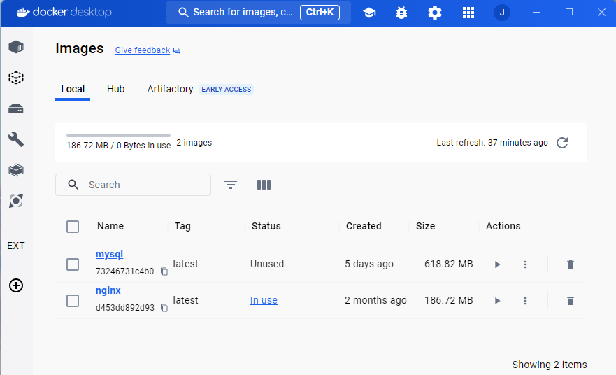 위에서 CLI로 설치한 nginx와 방금 설치한 mysql 이미지를 확인할 수 있다.