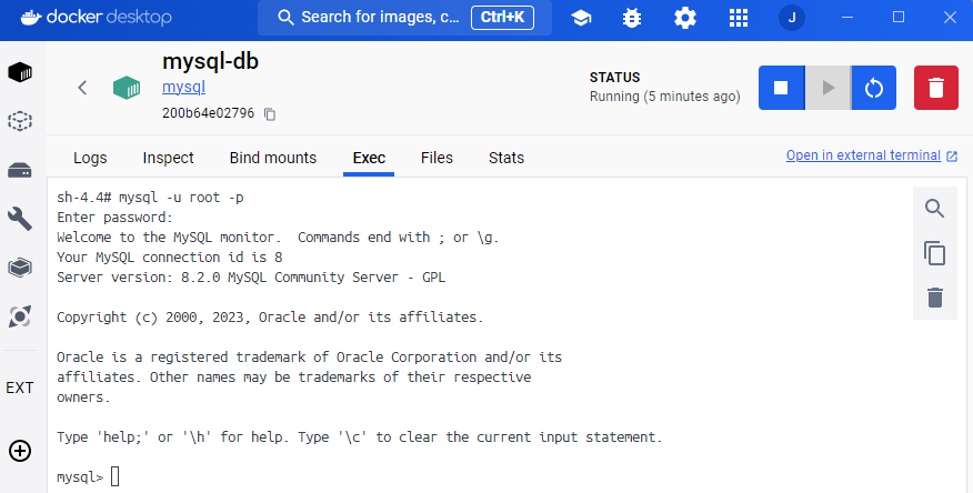 mysql-db 컨테이너 클릭 후 Exec 탭으로 이동한다.