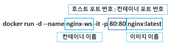 | --name | 컨테이너 이름을 설정 (위 명령어에서는 nginx -ws 라는 이름으로 설정) |
