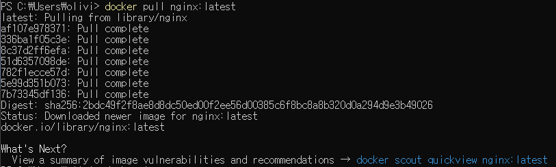 해당 명령어는 Docker Hub에서 최신 버전의 Nginx 이미지를 가져온다.