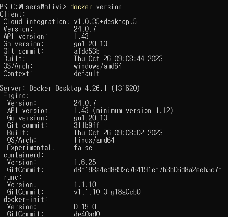 Powershell을 열어 docker version이라는 명령어를 실행시킨다.