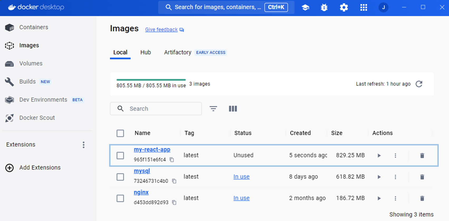 완료되면 Docker Desktop에서도 확인할 수 있다.