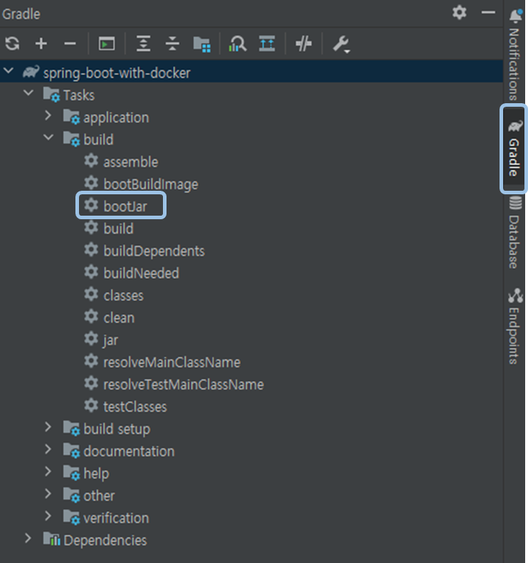 프로젝트 > Tasks > build > bootJar을 클릭해 실행한다.