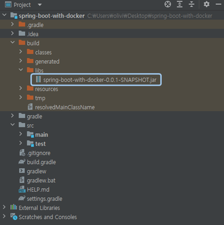 jar 파일은 프로젝트 > build > libs 안에 생성된다.