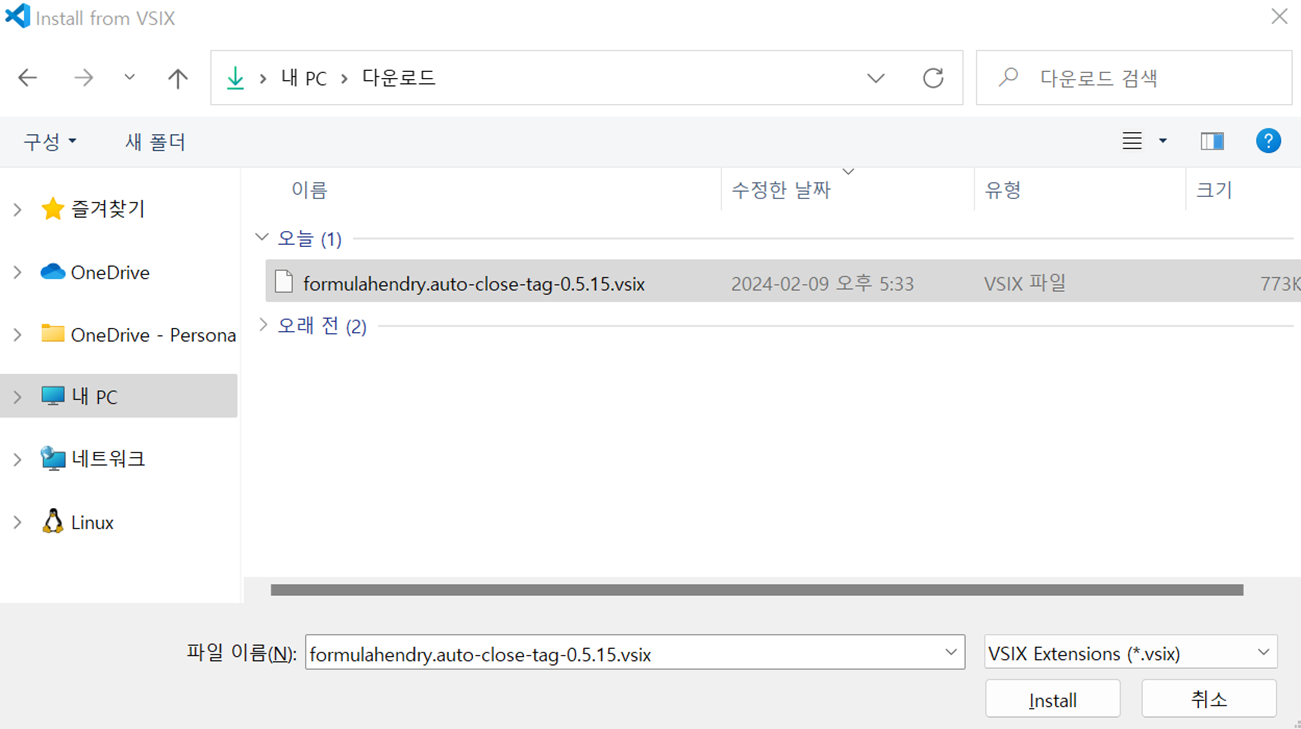 Install from vsix를 검색, 선택하면 파일을 선택하는 창이 나타난다.