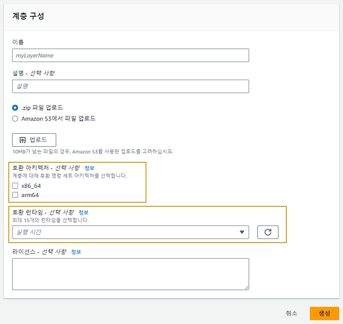 호환 아키텍처와 런타임 설정은 선택사항이긴 하지만